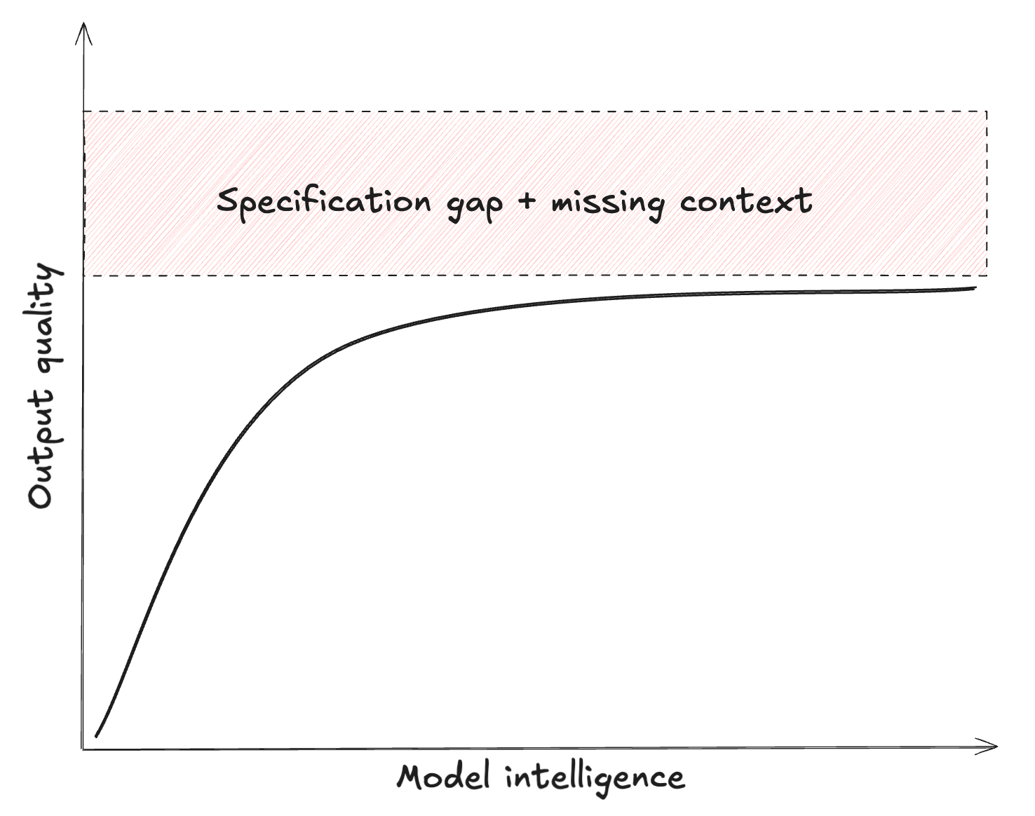 How much better would the answer be if the LLM were 10x ‘smarter’ but would have the same limited context?3 Likely a bit better, but not great. Unfortunately, increasing raw model intelligence only provides an asymptotic improvement in output quality. The quality of the spec and context dominate the outcome. Releasing those constraints is mostly a human task: we have to build better context engines, and write better problem specs.